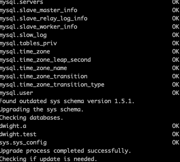 결과 값 (업그레이드 명령어 수행시 mysql의 system tables를 업그레이드 한 것을 확인 할 수 있음)