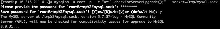 mysqlsh -u root -p -e "util.checkForServerUpgrade();" --socket=/tmp/mysql.sock